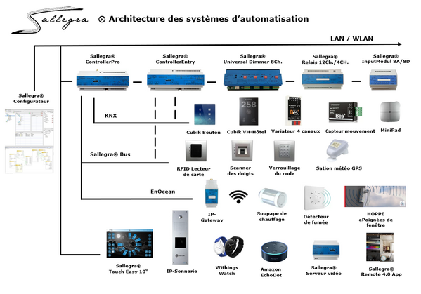 Le système d'automatisation Sallegra® est configuré à l'aide du configurateur Sallegra® en un point central du système, le contrôleur d'automatisation Sallegra®, où tous les fils se rejoignent. Cependant, pour plus de sécurité, il est également possible de distribuer l'automatisation à plusieurs contrôleurs, comme vous le souhaitez.