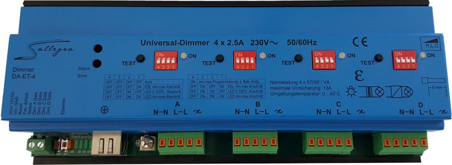 Der Sallegra® 4-fach Universal-Dimmer ist für alle gängigen dimmbaren Leuchtmittel geeignet und wird über Ethernet-Interface gesteuert. Es stehen 4 getrennte Dimmer-Eingänge und –Ausgänge zur Verfügung, die je mit 570 Watt belastbar sind. Die Regelkreise erkennen automatisch die angeschlossene Last und schalten dementsprechend automatisch von Abschnitt- auf Anschnitttechnologie um und steuern das Leuchtmittel mit einer geeigneten Steuerkennlinie an. Mit Hilfe von DIP-Schaltern kann aber bei bekannten Leuchtmittel auch die optimale Dimmart vergeben werden.