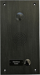 Die robuste Frontplatte der Aussensprechstelle ist aus Aluminium, farblos eloxiert und mit einer Kugelkopf-Farbkamera, Lautsprecher, Mikrofon, 2 Drucktastern und 2 Namensschildern ausgerüstet. Die komplette Audio- und Videokommunikation erfolgt per SIP über das Netzwerk.