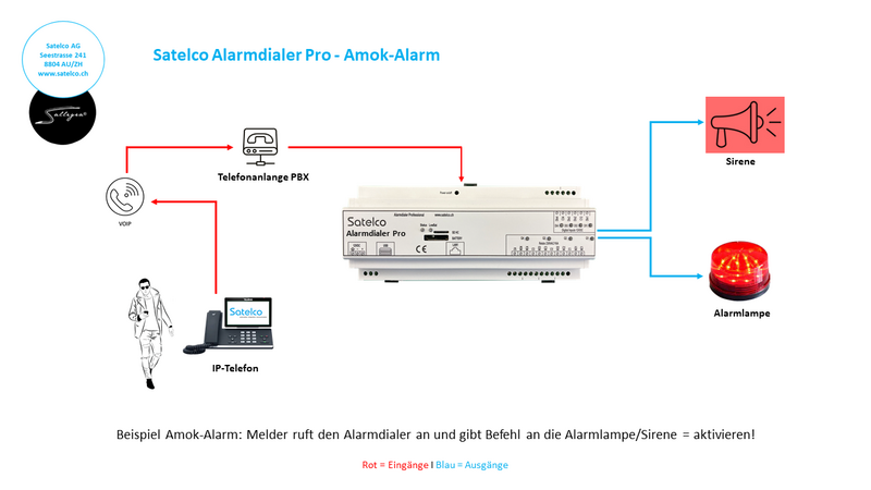 Amokalarm wird von immer mehr Stellen, Betrieben, Behörden oder Schulen separat behandelt. Ein wichtiger Grund dafür, sind Vorfälle, die sich in den letzten Jahren ereignet haben. Ein Ereignis (Notfall, Gefahr) wird von einem Auslöser (Person) wahrgenommen. Der Auslöser meldet das Ereignis durch Auslösen einer Alarmmeldung (z.B. mit dem Smartphone) über den Satelco Alarmdialer, dieser wiederum löst die Alarmlampe, Sirene aus.